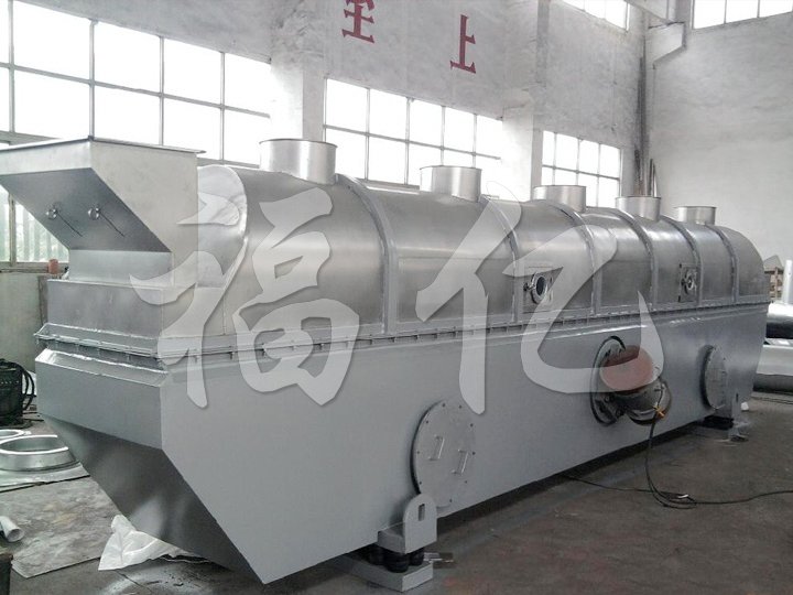 物料自進(jìn)料進(jìn)口進(jìn)入機(jī)內(nèi),在振動(dòng)力作用下,物料沿水平面流化床拋擲,向前連續(xù)運(yùn)動(dòng),熱風(fēng)向上穿過(guò)流化床同濕物料換熱后,濕空氣經(jīng)旋風(fēng)分離器除塵后由排風(fēng)1:3排出.干燥物料由排料進(jìn)口排出。