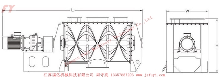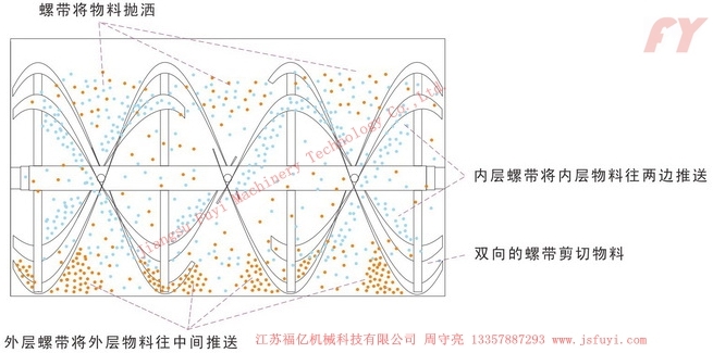 攪拌器軸,外螺旋帶在動力的驅(qū)動下,其盤繞形式配合旋轉方向把物料從U型倉兩端向中央地帶推動,而內(nèi)螺旋帶把物料從中間向兩端推動,形成對流混合。混合機臥式筒體底部中央開設出料口,外層螺旋帶的蝸旋結構配合主軸旋轉方向驅(qū)趕筒壁內(nèi)側物料至中央出料口出料,確保筒體內(nèi)物料出料無死角。