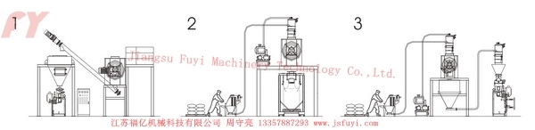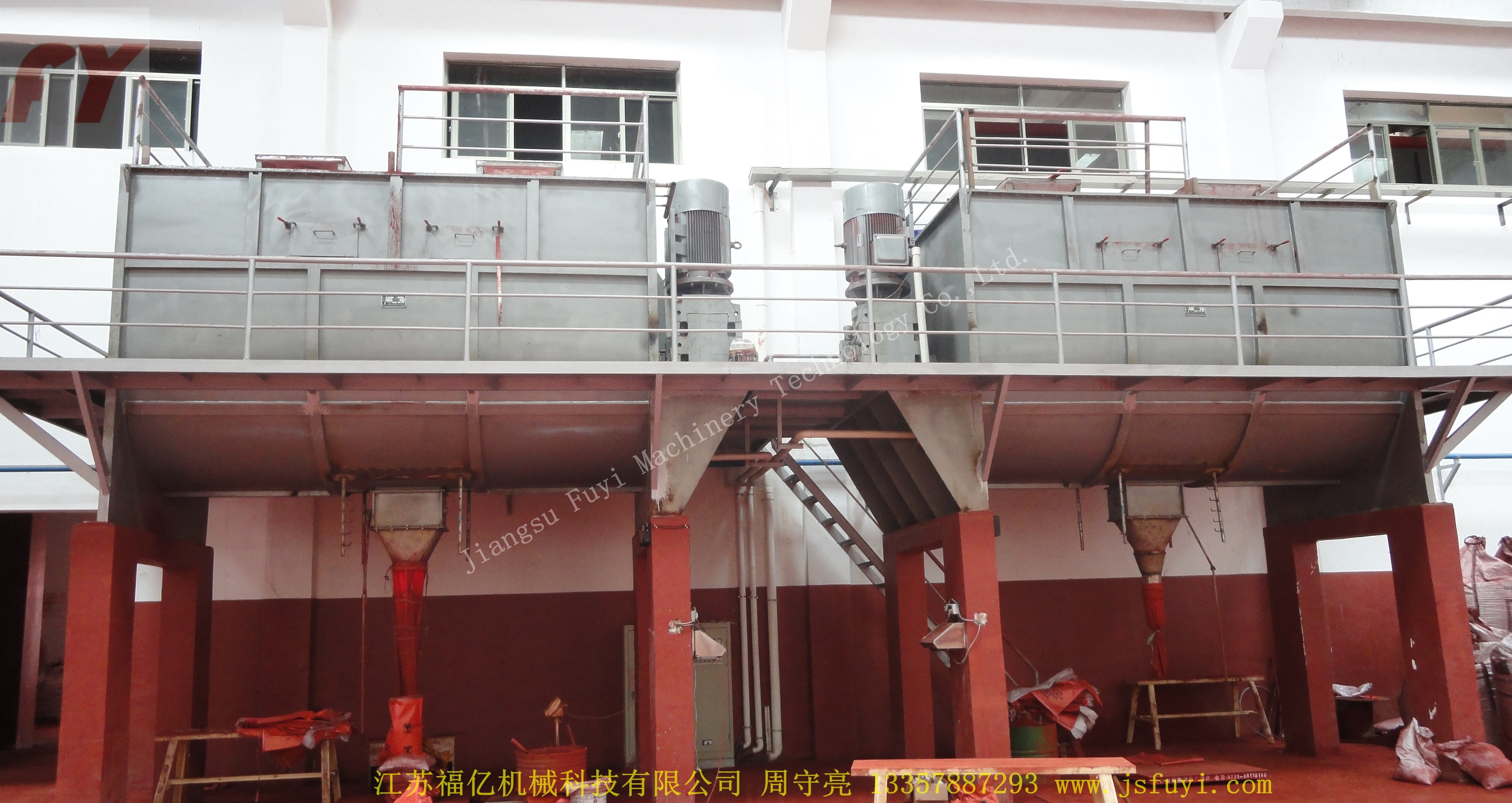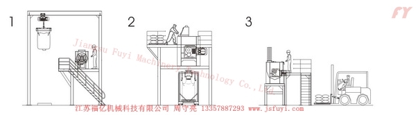2:采用真空上料方式,地面投料,混合出料后采用噸帶包裝機;