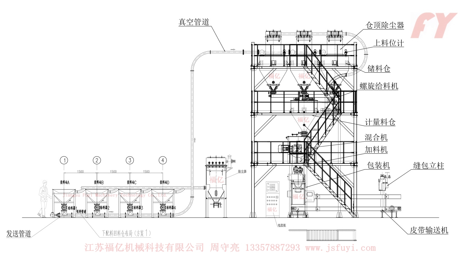 2:采用斗式提升機送料,進混合、倉儲、包裝;