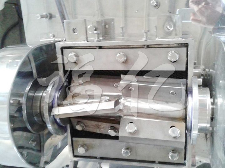 物料由進料斗送進粉碎室,經刀刃和刀座的沖擊,旋轉刀和固定刀同時剪切粉碎,由于受到旋轉離心力的作用,物料自動從出口處流出。