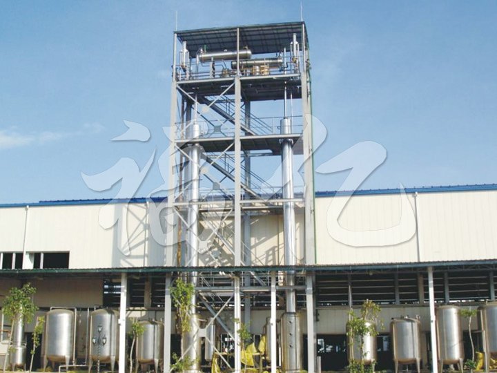 本裝置采用高效的陶瓷制波紋填料。蒸餾塔體采用不銹鋼制作,從而防止了鐵屑堵塞填料的現象,延長了裝置的使用期限。本裝置中凡接觸酒精的設備部份如冷凝器、穩壓罐、冷卻蛇管等均采用不銹鋼,以確保成品酒精不被污染。W型之蒸餾釜采用可拆式U型加熱管,在檢修時可將U型加熱管移出釜外,便于對加熱管外壁及蒸餾釜內壁進行清洗。