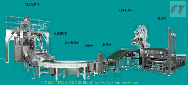 產(chǎn)品經(jīng)過(guò)一系列的生產(chǎn)后經(jīng)過(guò)自動(dòng)稱重包裝秤裝入包裝袋中,再由倒袋裝置將其推倒運(yùn)輸,整形機(jī)將其推平整,使其適合碼放,再經(jīng)由金屬檢測(cè)機(jī)、重量復(fù)檢機(jī)進(jìn)行排除篩選,將不合規(guī)格產(chǎn)品推出生產(chǎn)線外,留下的產(chǎn)品在由噴墨打印機(jī)進(jìn)行打碼識(shí)別,到包裝線末端則有智能碼垛機(jī)按照已設(shè)定的程序進(jìn)行碼放,^后由叉車叉走托盤,完成整個(gè)包裝生產(chǎn)流程。