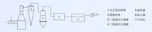 氣體經(jīng)加熱爐加熱至物料煅燒溫度后,利用文丘里原理帶進煅燒物料至煅燒爐內(nèi)(高溫熱氣體與物料一起切向進入爐主體內(nèi)),在煅燒爐主體下部物料與熱氣得到充分混合,使物料溫度瞬間達到煅燒溫度后由氣體夾帶上升,完成煅燒。然后煅燒后的物料與尾氣一起進入收集、換熱裝置,換熱后的尾氣再經(jīng)除塵器后排空,換熱得到的熱量,進行回收利用。