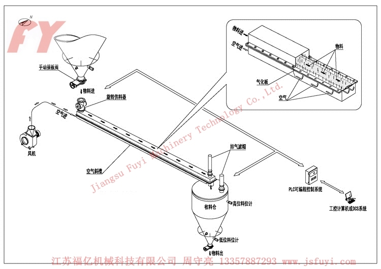 1. 物料在有透氣層斜槽上面隨氣流下滑以實現輸送;