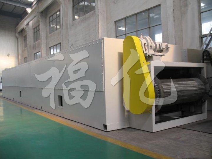整個(gè)生產(chǎn)線(xiàn)為全封閉型(對(duì)物料而言),由擺動(dòng)布料段、干燥段、出料段三部分組成。擺動(dòng)布料段作用使海藻均勻分散在網(wǎng)板上,并且勻速輸送到干燥段,海藻經(jīng)過(guò)80℃熱風(fēng)干燥段,90℃熱風(fēng)干燥段和120℃熱風(fēng)干燥段后,再經(jīng)過(guò)出料段排料。循環(huán)風(fēng)向及各單元內(nèi)風(fēng)的循環(huán)為向下式,即加熱后的空氣由引風(fēng)機(jī)吸入,在風(fēng)機(jī)出風(fēng)口首先預(yù)分布再經(jīng)過(guò)孔板均風(fēng)后,熱風(fēng)從物料的下面向上(或從物料的上面向下)穿透物料層。