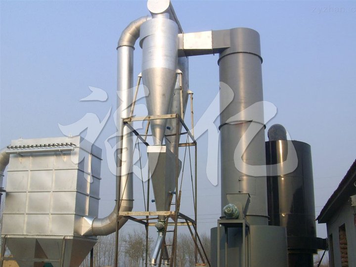 熱空氣由入口管以適宜的噴動速度從干燥機(jī)底部進(jìn)入攪拌粉碎干燥室,對物料產(chǎn)生強(qiáng)烈的剪切、吹浮、旋轉(zhuǎn)作用,于是物料受到離心、剪切、碰撞、摩擦而被微粒化,強(qiáng)化了傳質(zhì)傳熱。在干燥機(jī)底部,較大較濕的顆粒團(tuán)在攪拌器的作用下被機(jī)械破碎,濕含量較低、顆粒度較小的顆粒被旋轉(zhuǎn)氣流夾帶上升,在上升過程中進(jìn)一步干燥。由于氣固兩相作旋轉(zhuǎn)流動。固相慣性大于氣相,固氣兩相間的相對速度較大,強(qiáng)化兩相間的傳質(zhì)傳熱.所以該機(jī)生產(chǎn)強(qiáng)度高。
